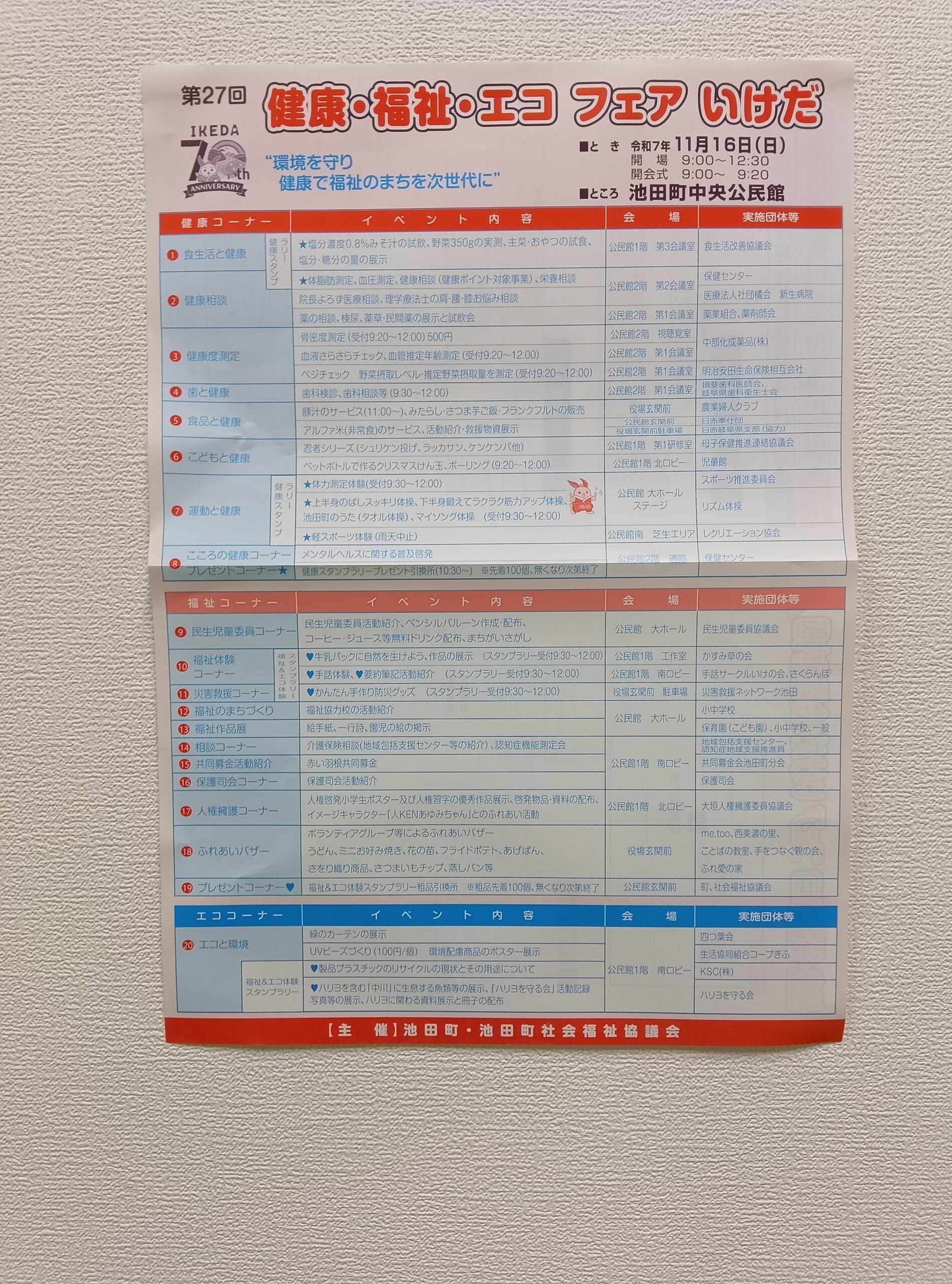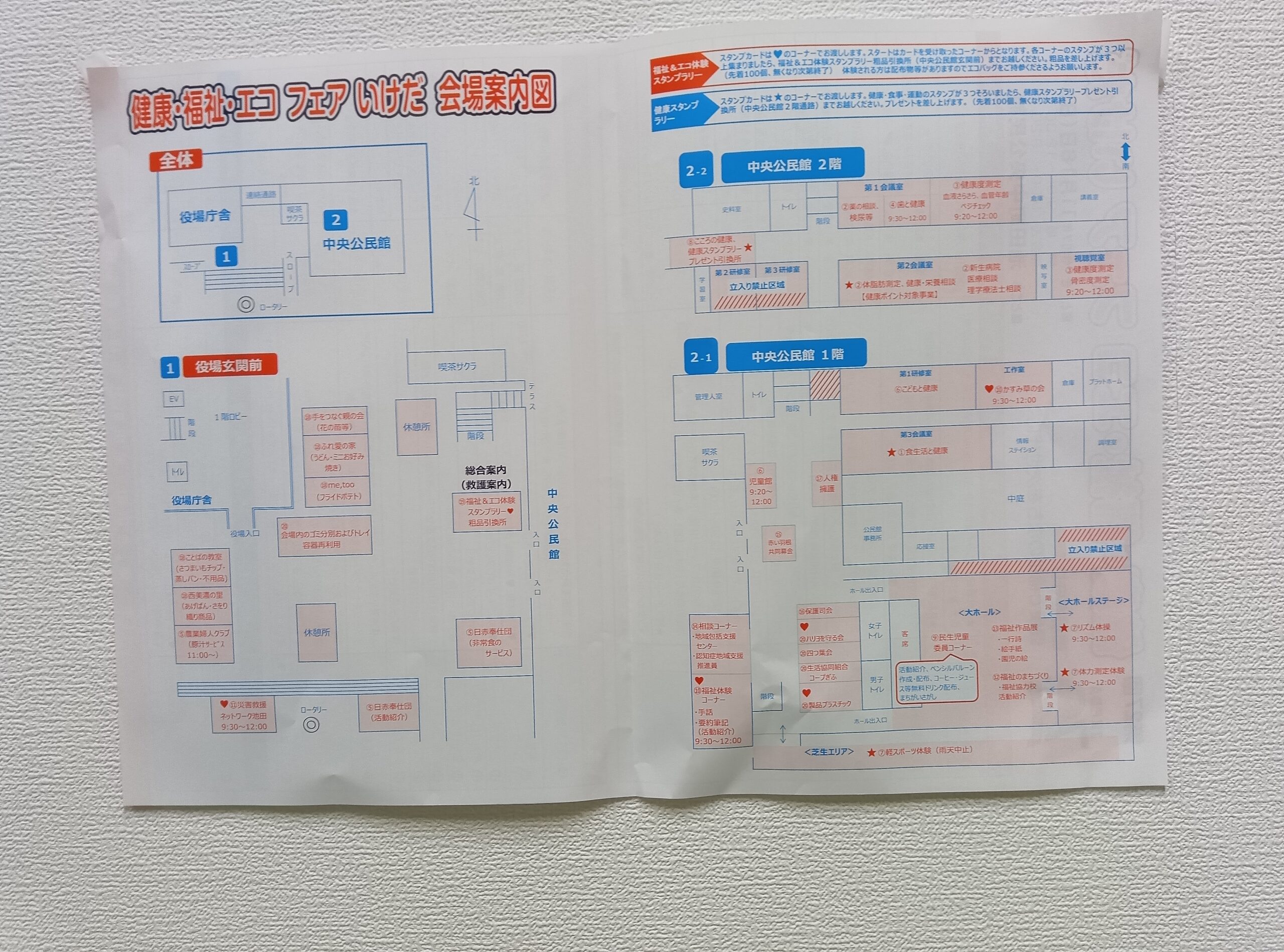 健康・福祉・エコ フェアいけだ 開催します(11月16日(日))! 2025.11.10 健康・福祉・エコ フェアいけだを開催します! こんにちは。池田町社会福祉協議会です。 11月16日(日)9:00~12:30まで池田町公民館一帯で、「第27回 健康・福祉・エコ フェアいけだ」が開催されます。 健康や福祉、環境にまつわる体験をスタンプラリーでめぐったり、絵手紙や園児の作品掲示、バザー出店などが行われます。 ぜひご来場ください。 イベント内容 会場図 絵手紙